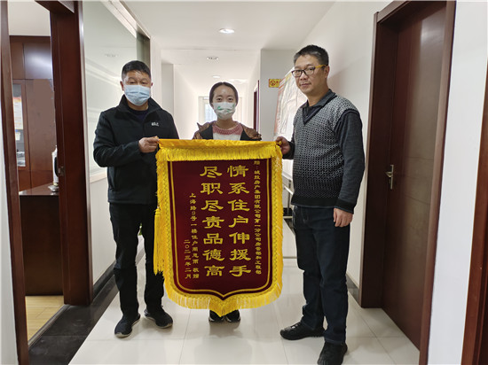 2月20日上午,上海路9号的周女士来到武汉城投房产集团有限公司第一分公司,将一面印有“情系住户伸援手 尽职尽责品德高”的锦旗送到工作人员手中,衷心感谢公司房管人员、工程维修人员,高效及时帮助其解决家中下水管道油污堵塞问题,对他们认真负责的工作态度和为住户排忧解难的敬业精神表示由衷的肯定及感谢。